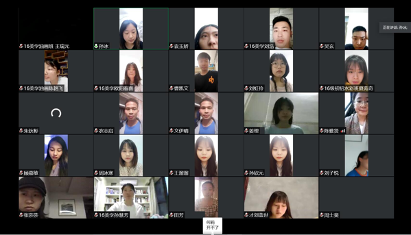 2020年5月21日下午七点,太阳成集团tyc122cc组织2016级全体顶岗实习员工召开线上总结大会”。会议由公共美术教研室主任孙冰老师主持,蔡惠萌副经理,谷炽辉、曾素艳、农志启、张莎莎、齐泽湘、唐浩榕老师出席了会议,2016级全体顶岗实习员工共170人参加了会议。