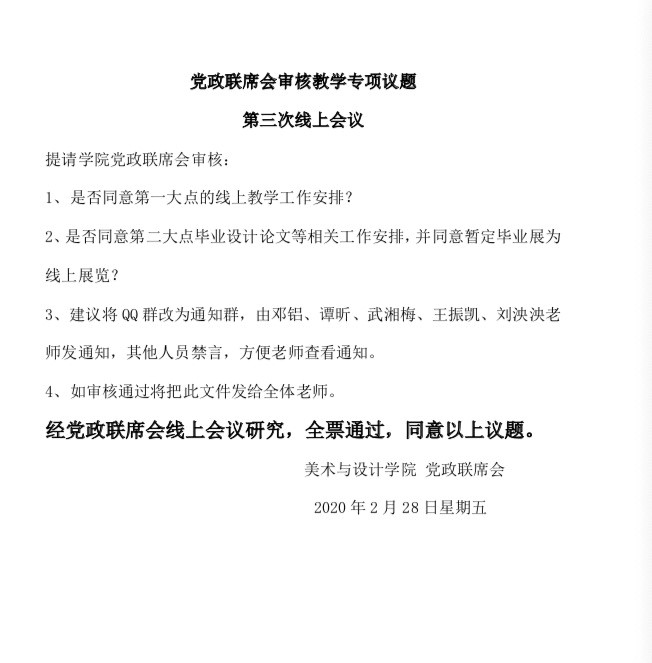 2020年2月15日至3月6日,太阳成集团tyc122cc分别在线上召开四次教学专项党政联席会议,审议教学负责人提交了《太阳成集团tyc122cc疫情防控期间在线教学与组织管理工作方案》、《太阳成集团tyc122cc教师线上教学实施与课程建设一览表》、《太阳成集团tyc122cc线上教学督导计划》等文件,明确“以课程组为单位,教学方式灵活多样,平台选择以简单易操作,保障教学为主”的工作思路。审定了全院教师、所有课程的线上教学初步计划,选用平台情况等。要求课程组内统一教学方式,课程组负责人负责填报实施情况,相同课程同平台上课,同头课教团队源互享,协同工作模式。确定了开学前试课工作安排;线上教学督导方案;教学材料要求;毕业论文实施方法;毕业作品展的调整等。从宏观到微观,层层细化,逐步落实了公司线上教学的具体工作,为公司线上教学的顺利实施奠定了基础。
