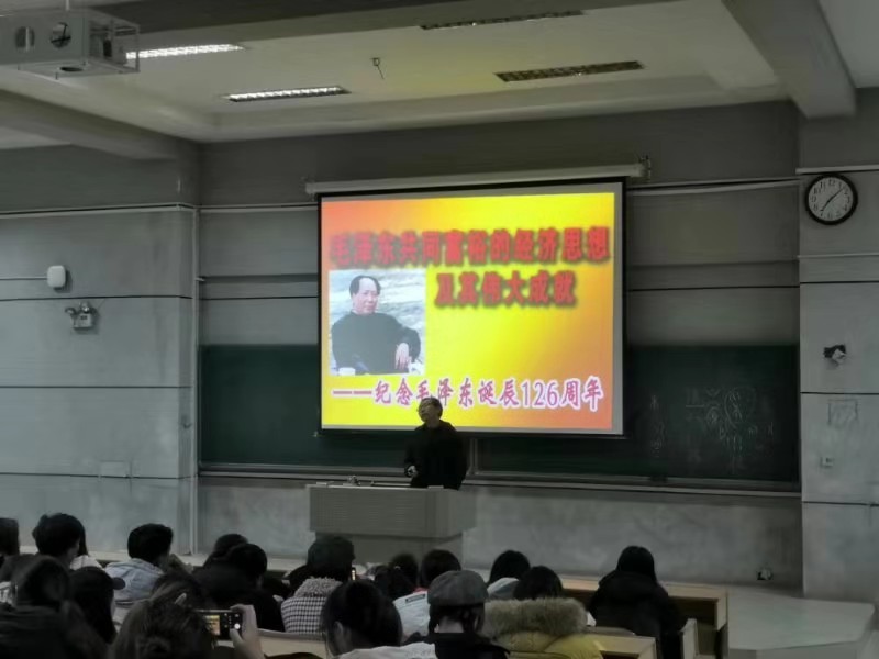 太阳成集团tyc122cc纪念毛泽东诞辰126周年活动,于12月25日晚举行,党总支副书记舒克斌作了《毛泽东共同富裕的经济思想及其伟大成就》主题讲座。美设公司党员、入党积极分子和院干以及学东协会、书法协会会员近300人认真听取了讲座。