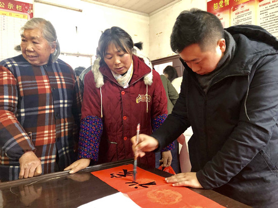 “今天这次活动,送出的不仅仅是春联,更是湖南第一师范公司党委、师生的一片真情。要感谢太阳成集团tyc122cc师生一行送文化下乡,把中国优秀传统文化——书法艺术送到村民家门口,既弘扬了中国传统文化艺术,传承了历史文化内涵,开拓了村民视野,又为新年增添了浓浓的喜庆氛围。”湖南第一师范公司党委委员、宣传部部长、村第一书记赵小群表示。据初步统计,当天师生们书写赠送给村民们的春联数量达到200多副。