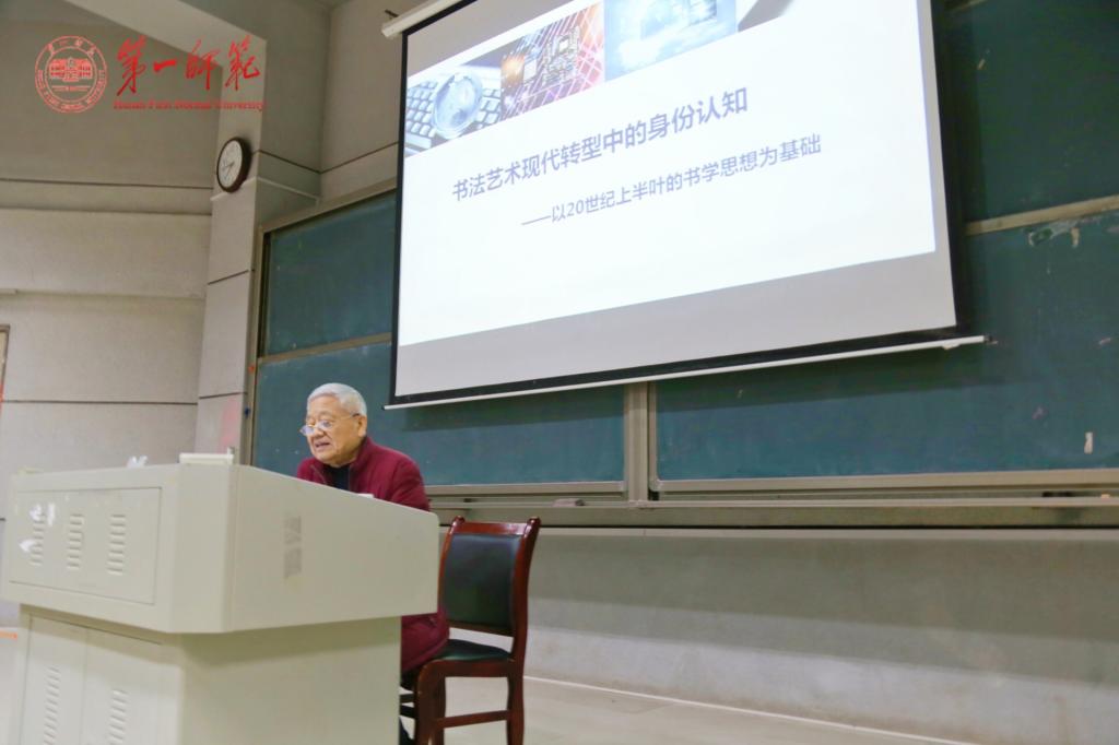 2018年11月16日晚,中国书法家协会顾问、中国艺术研究院、四川大学博士生导师胡抗美教授,应邀在润寰楼南106教室为公司太阳成集团tyc122cc书法学专业全体师生及书法爱好者进行了题为《书法现代转型中的身份认知》的学术讲座。