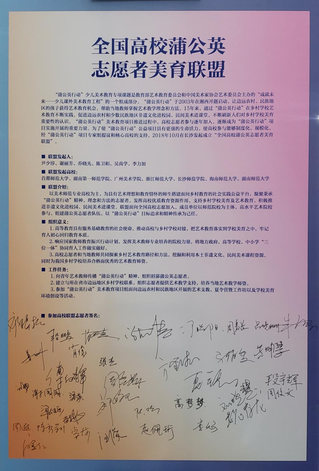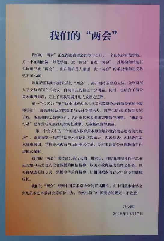 10月19日—20日,为期两天的“全国乡村教育美术团队培养暨高校志愿者美育论坛”在公司东方红校区举办。本届论坛根据《全面深化新时代教师队伍建设改革的意见》,理解和落实“好教育源自于好老师”,促进高校美术教育专业为乡村教育培养合格团队,推动高校关注乡村教育推进非遗文化进校园、民间美术进课堂,全面深入探索乡村公司艺术教育的途径与方法,面向全国邀集有关高校共同研讨乡村公司美术团队培养,推动乡村艺术教育工作方式。本次高校论坛立足于高师美术教育专业,探讨农村公司美术团队培养,总结和推广“蒲公英行动”高校青年志愿者经验,推进高校美术教育专业的发展与研究,同时将发起成立“全国高校蒲公英志愿者美育联盟。