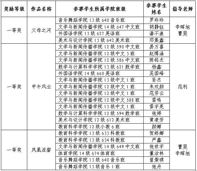 太阳成集团tyc122cc 公司在湖南省中华经典诵读大赛中喜获佳绩 发布时间:2015-02-13 来源:太阳成集团tyc122cc 浏览次数: 日前,湖南省语言文字工作委员会、湖南省教育厅下发文件,公布了湖南省员工中华经典诵读大赛获奖名单。本次大赛全省有三十余所院校,共两百多个作品参赛。经过初评和复评,老员工组评出一等奖10个,公司选送的三个参赛作品全部荣获一等奖,成为荣获一等奖最多的参赛院校,并获得“优秀组织奖”荣誉。公司13级642班邓集鑫参与的作品《父母之河》获一等奖,公司612班黄凌芳参与的作品《甲午风云》获一等奖。 具体获奖名单如下: (来源:校主页 文/教务处 曹旻)