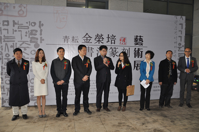 仪式上,副董事长童小娇发表了热情洋溢的致辞。童小娇首先代表公司对金先生的到来表示热烈的欢迎和诚挚的谢意,并对金荣培先生和这次书艺展作了简要介绍。金荣培是韩国著名书法家篆刻家,成均馆大学博士毕业,任韩国篆刻学会事务局长,西泠印社名誉社员,大韩民国美术大展审查委员,富川书艺文人画协会会长。童小娇感谢金先生对公司书法专业的发展提供了有力的支持和帮助,希望师生们充分利用好这一平台。金先生作为友谊的桥梁,不但将推进公司书法专业的发展,更将给公司对外文化交流和合作带来良好的契机。