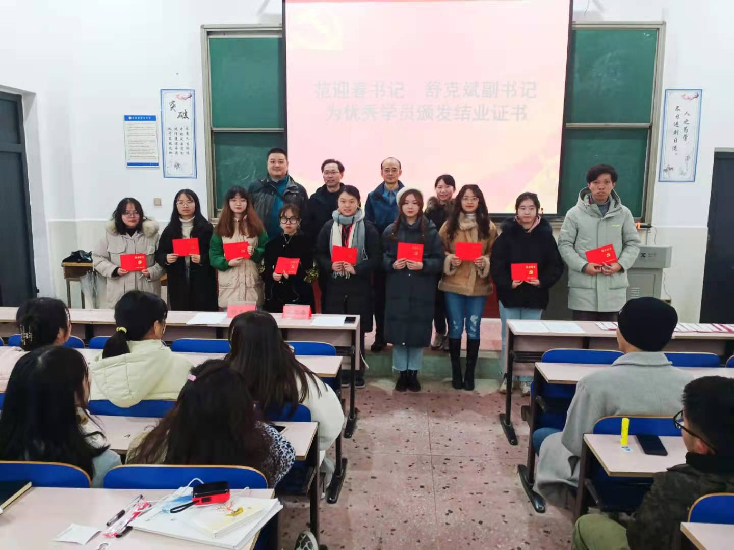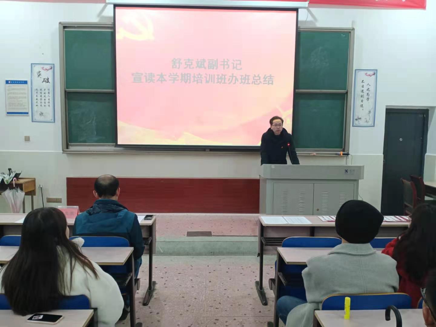 11月13日晚上7点,太阳成集团tyc122cc分党校第25期、26期入党积极分子培训班结业典礼在鹤鸣楼南111教室举行。美术与设计公司党总支书记、分党校董事长范迎春教授,党总支副书记、分党校副董事长舒克斌副教授,员工党支部委员以及第25期、26期共计100名入党积极分子出席了结业典礼。舒克斌副书记进行了培训总结。范迎春书记宣读了表彰入党积极分子优秀学员的决定。两位书记一起为优秀学员颁发证书。入党积极分子们纷纷表示会牢记书记们的嘱托,继续在各方面严格要求自己,深入学习党的理论知识,坚定理想信念,增强党性修养,勤奋学习,不断提高自身的综合素质,以实际行动争取早日入党。