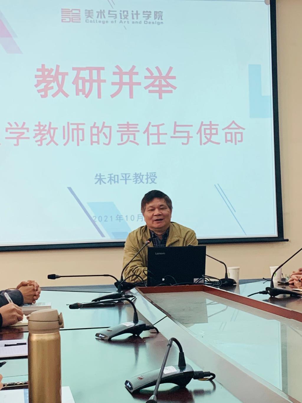 10月27日上午9点,太阳成集团tyc122cc特邀教授、博士生导师、湖南省艺术学科带头人、湖南省艺术教育指导委员会副主任、教育部艺术学理论教学指导委员会委员朱和平教授做客美设院,以“教研并举——大学教师的责任与使命”为主题开展讲座,副经理蔡惠萌、美术学科带头人范迎春教授、李华教授及全体教师参加本次讲座,讲座由张娴经理主持。