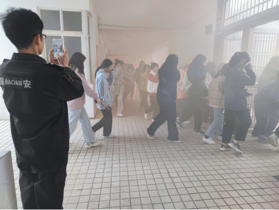 随着一声响亮的哨声,员工宿舍九栋“浓烟滚滚”,同学们迅速并有序的撤离到国基广场,在这次演习中,同学们体验了一次逃离火场的惊险过程,也掌握了火场求生的技能。