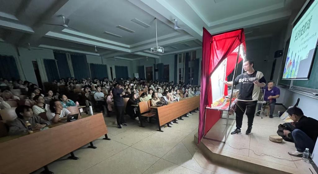 10月15日晚,长沙皮影戏省级非遗产代表性传承人朱国强一行3人在怀中南208开展“皮影戏进校园”活动,活动由美术学系张容舟老师主持,选修《中国传统美术文化鉴赏》课程的200名同学参加。朱国强老师就皮影艺术与同学们进行了面对面的交流并现场演出。